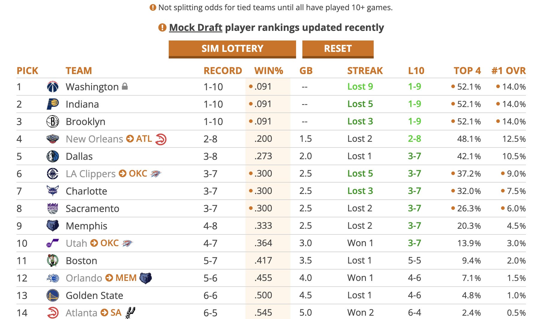6686 Sports News от 12 ноября Американское СМИ Tankathon обновило сегодня вероятность проведения лотереи драфта 2026 года на основе текущих рекордов каждой команды лиги. Поскольку у «Уизардс», «Пэйсерс» и «Нетс» на счету 1 победа и 10 поражений, вероятность получить выбор под первым номером составляет 14%, а вероятность получить четыре лучших выбора — 52,1%.