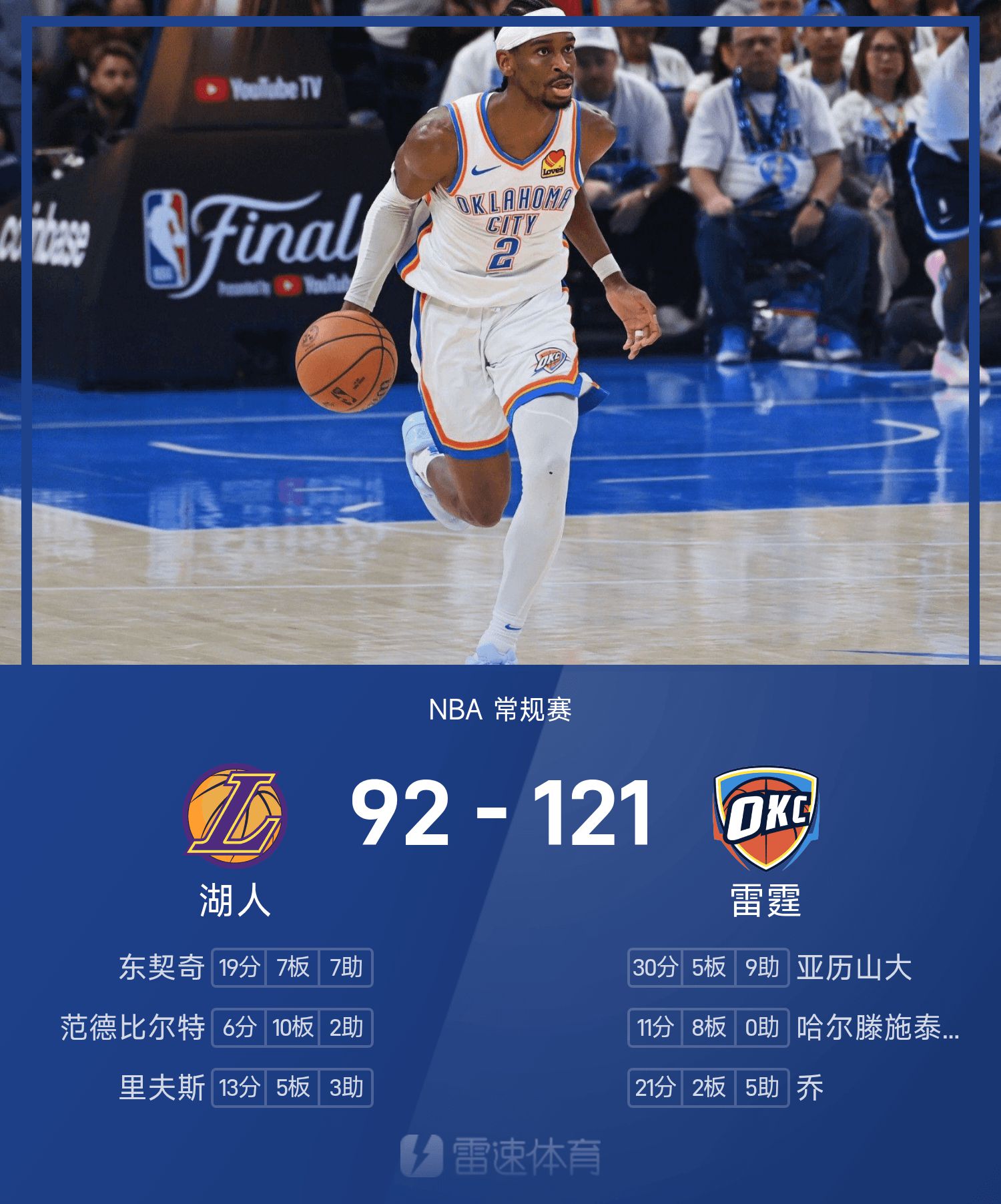 6686 Спорт 13 ноября Новости В регулярном сезоне НБА 25/26 «Тандер» встречались с «Лейкерс». В конце игры «Тандер» победил «Лейкерс» со счетом 121–92. Александр набрал рекордные для игры 30 очков, 5 подборов и 9 передач, что привело «Гром» к победе.