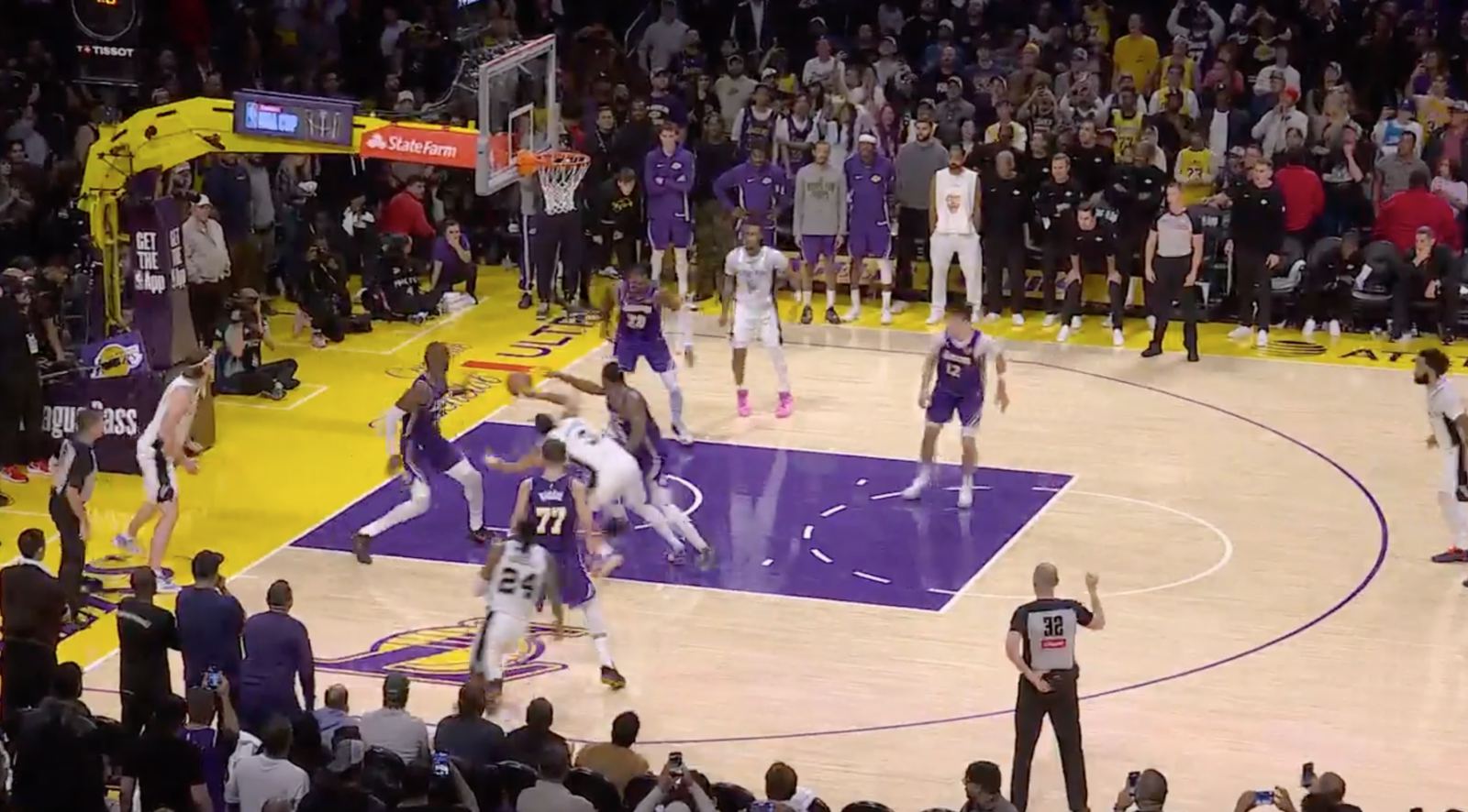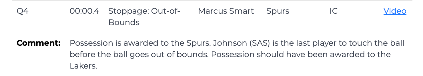 За последние 0,4 секунды, прежде чем мяч вышел за пределы поля, Келдон Джонсон был последним, кто коснулся мяча, но рефери объявил Смарта, и мяч вышел за пределы поля, и мяч был передан «Шпорам». Это было неправильное решение, и мяч должен был быть отдан «Лейкерс».