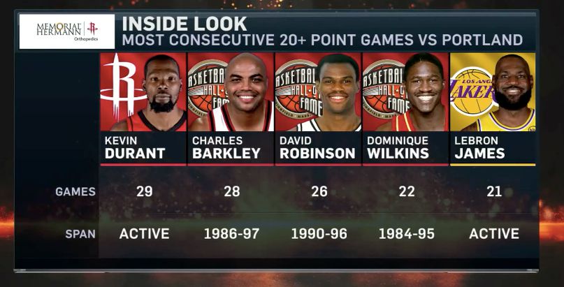 Дюрант сделал 8 из 12 бросков за тайм и набрал 20 очков, набрав 20+ очков против «Трэйл Блэйзерс» в 30 играх подряд.
