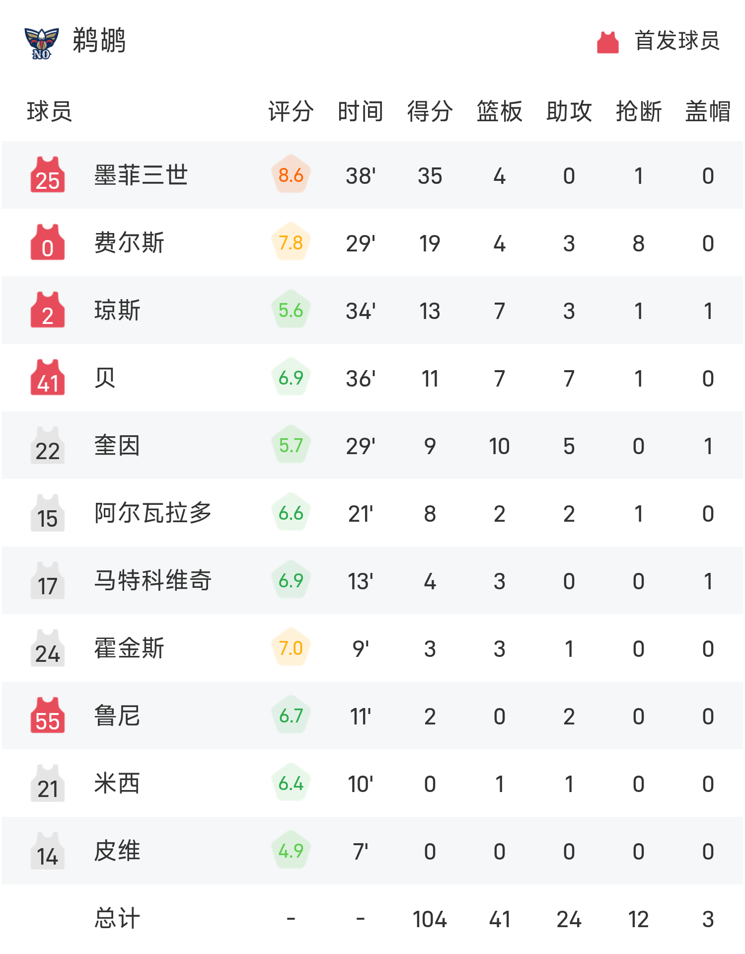 Ривз набрал 31 очко, 4 подбора и 7 передач и привел команду к победе. Мерфи III набрал рекордные для игры 35 очков и 4 подбора.