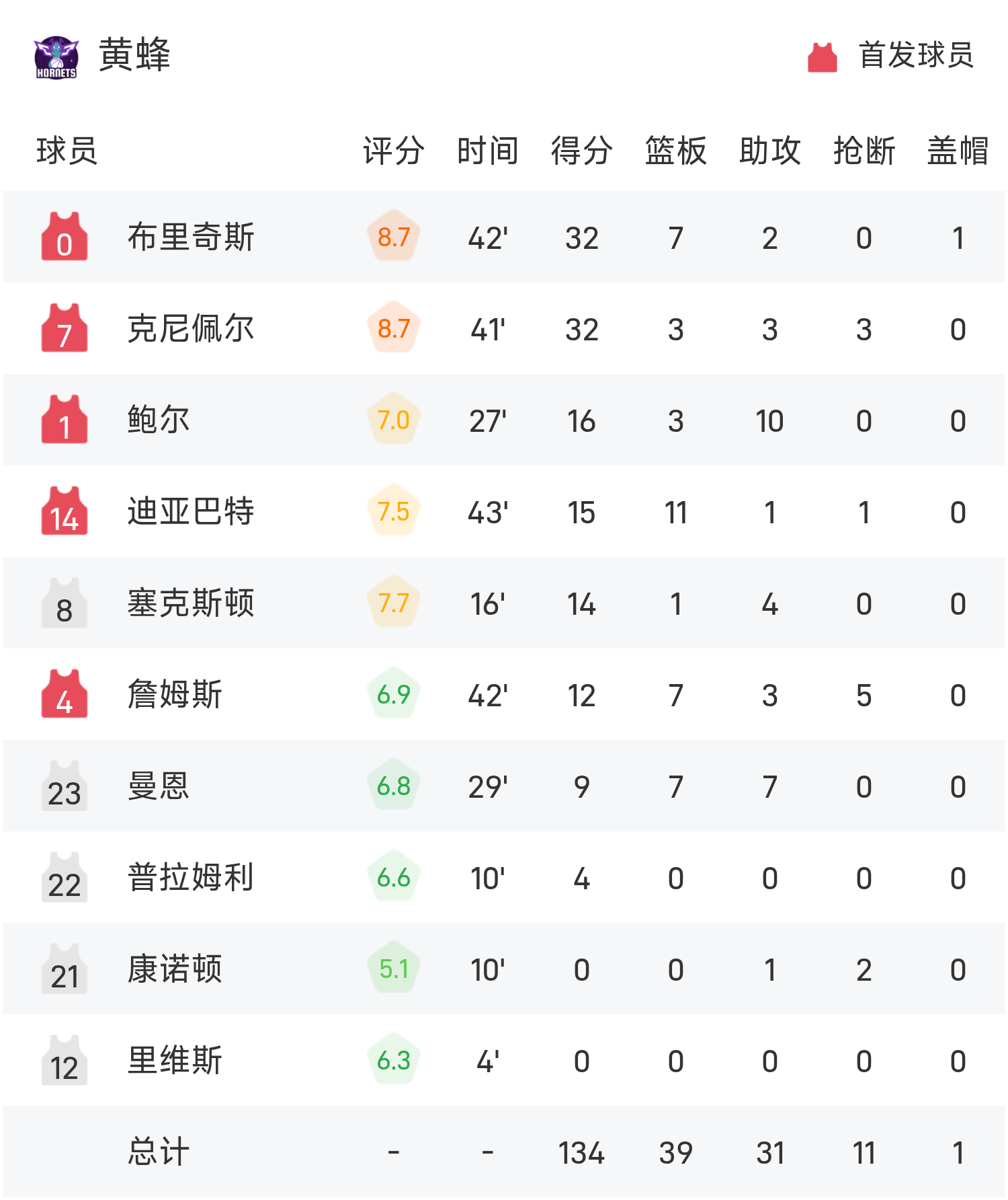6686 Спорт 15 ноября Новости В групповом матче Кубка НБА регулярного сезона НБА 25/26 «Бакс» встретились с «Хорнетс». В конце игры «Бакс» победили «Хорнетс» со счетом 147–134. Кузьма набрал 29 очков, 10 подборов и 5 передач и привел команду к победе. Бриджес набрал рекордные для игры 32 очка, 7 подборов и 2 передачи.