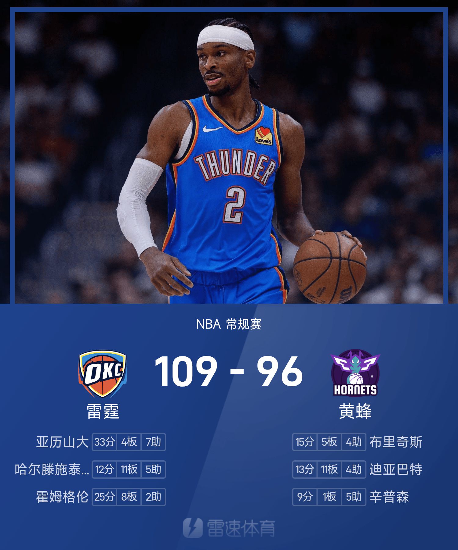 Отчет НБА: у Александра 33 очка и 7 передач, Тандер обыграл Хорнетс со счетом 109-96