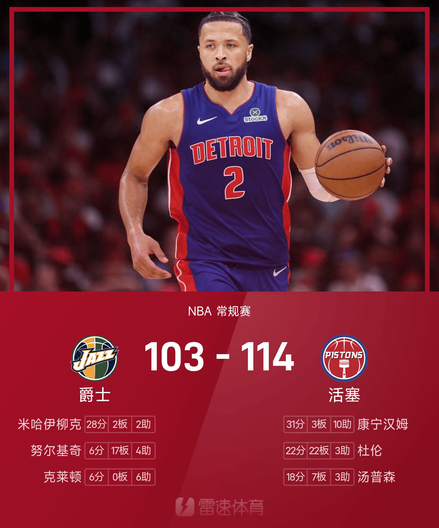 6686 Спорт Ноябрь 06 Новости В регулярном сезоне НБА 25/26 «Пистонс» встретились с «Джаз». В конце игры «Пистонс» победили «Джаз» со счетом 114–103. Каннингем набрал рекордные для игры 31 очко, 3 подбора и 10 передач, что привело «Пистонс» к победе.
