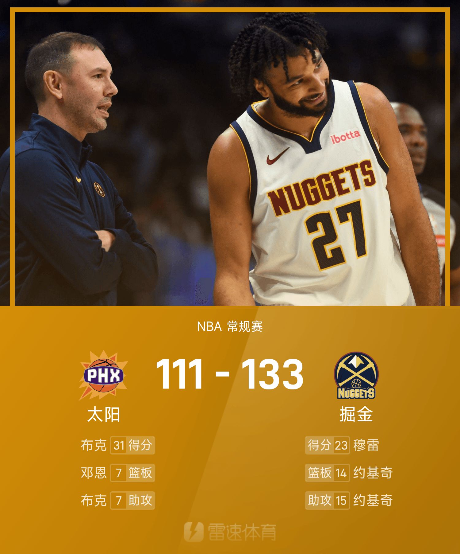 Защитник Наггетс Мюррей набрал 23 очка, 6 подборов и 5 передач. Внутренний костяк Йокич в третьей четверти оформил трипл-дабл, набрав 14 очков, 14 подборов и 15 передач. В двух играх подряд у него был трипл-дабл.