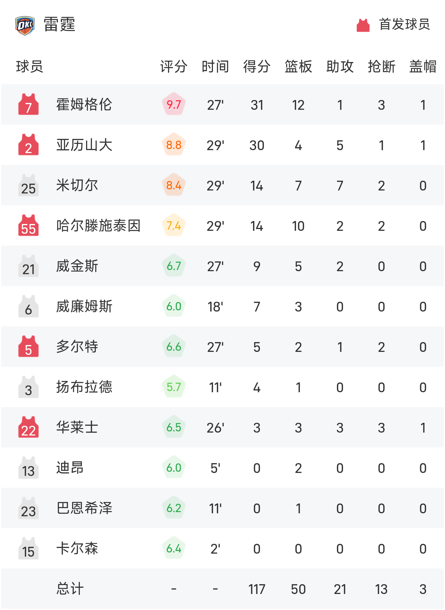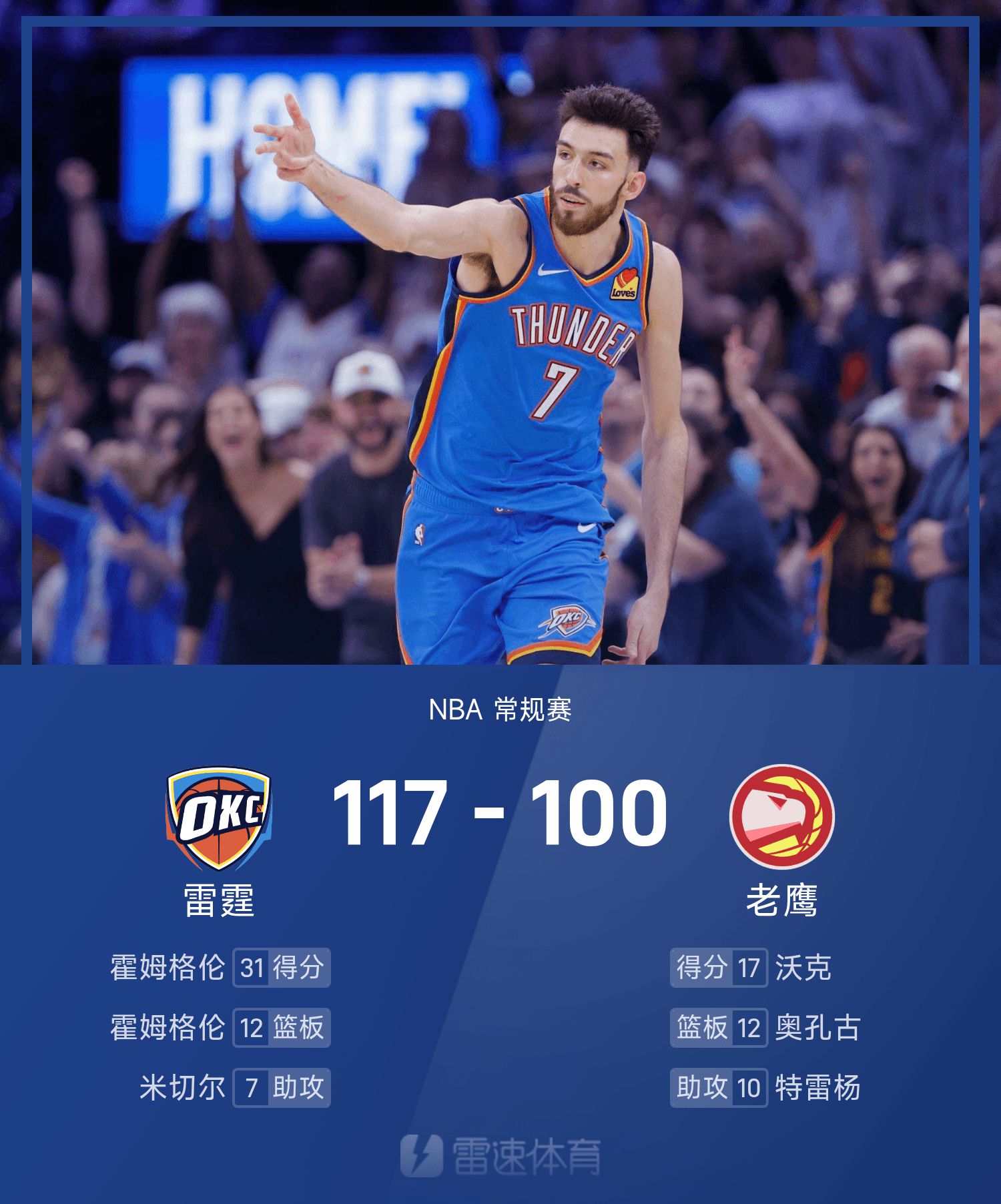 Хольмгрен набрал рекордные для игры 31 очко, 12 подборов и 1 передачу, что привело «Гром» к победе.