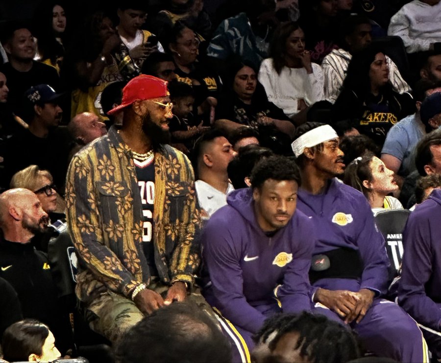Репортеры «Лейкерс» поделились фотографиями с места происшествия. Леброн появился в сторонке в форме своего младшего сына Брайса из Университета штата Аризона, чтобы посмотреть игру, а его старший сын Бронни сидел рядом с ним.