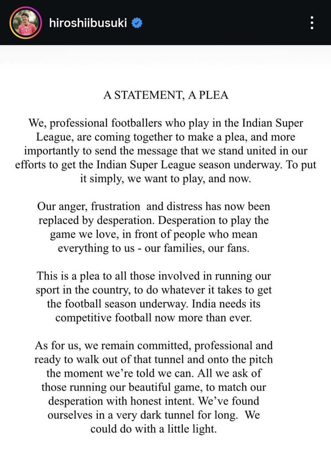 "Первоначальный гнев, разочарование и боль теперь сменились от отчаяния мы готовы снова бежать перед нашими семьями и болельщиками. Любимое зеленое поле. Мы призываем всех, кто отвечает за управление индийским футболом, приложить все усилия, чтобы начать новый сезон как можно скорее.