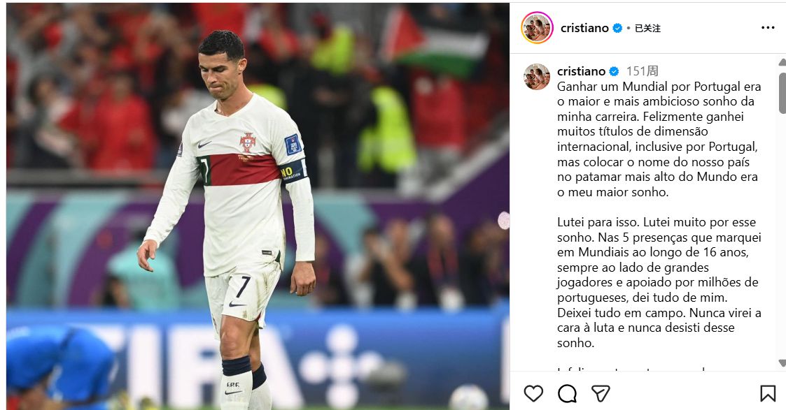 Однако взгляды Роналду после чемпионата мира по футболу в Катаре 2022 года сильно отличаются от нынешних. После досадного поражения Португалии от Марокко Роналду написал в социальных сетях, что выиграть чемпионат мира для Португалии – величайшая мечта в его карьере, и он никогда не отказывался от этой мечты.