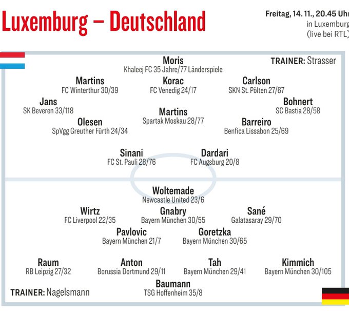 6686 Sports сообщил 13 ноября, что на европейском групповом этапе отборочного турнира чемпионата мира сборная Германии бросит вызов сборной Люксембурга на выезде. Перед игрой немецкое спортивное издание «Кикер» спрогнозировало стартовый состав немецкой команды на эту игру. Среди них пятый номер Уолтер Мэдер, играющий за «Ньюкасл», фигурирует в позиции одиночной стрелки. Вирц, который боролся в «Ливерпуле», получил стартовую возможность и появился на позиции левого нападающего. Сане, вернувшийся в сборную, оказался на позиции правого форварда.
