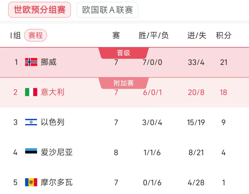 В группе I Норвегия в настоящее время занимает первое место с 21 очком, Италия занимает второе место с 18 очками, Израиль (9 очков), Эстония (4) и Молдова (1) потеряли надежду побороться за первые два места.