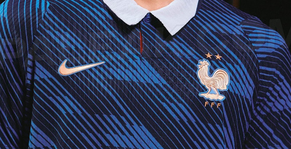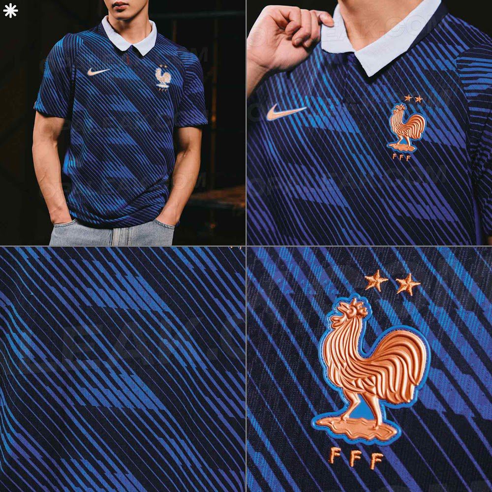 Униформа команды выполнена в темно-синем узоре по всему телу и включает в себя элементы Французской федерации футбола (FFF). Вырез представляет собой современный воротник-поло с белым спереди и темно-синим сзади, с красными деталями, скрытыми на застежке воротника.