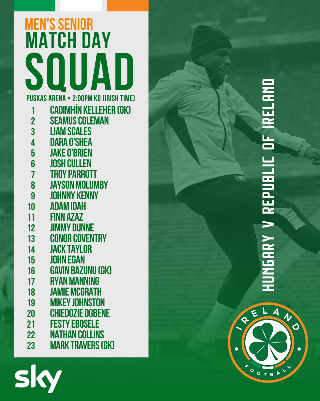 6686 Sports сообщила 16 ноября, что сегодня вечером в группе F чемпионата мира по Европе гостевая команда из Ирландии сразится с Венгрией. Перед игрой в официальных социальных сетях ирландской команды был опубликован состав на этот раунд: