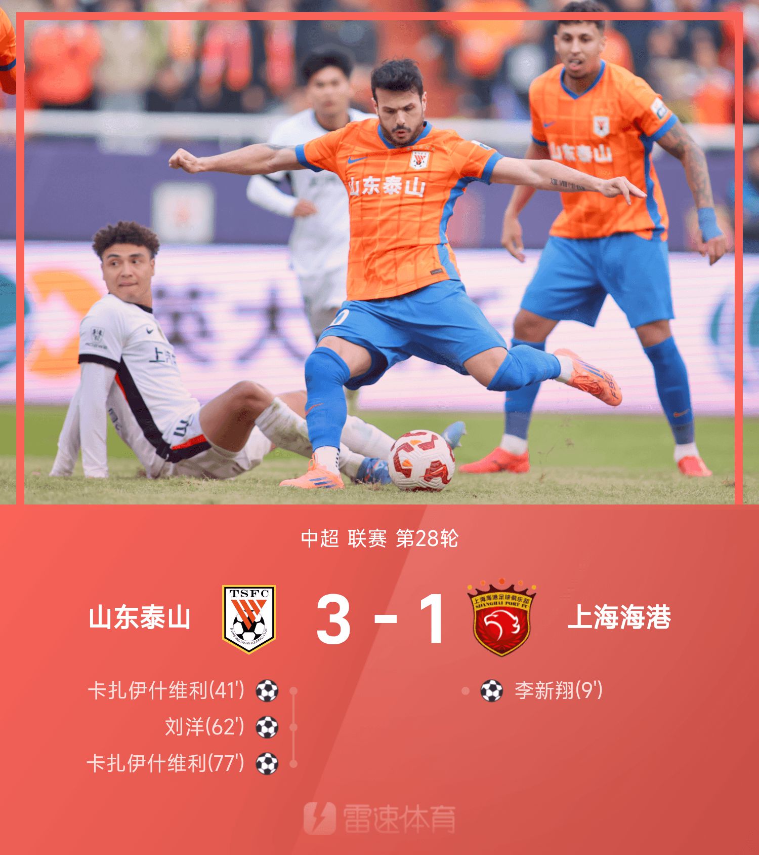 6686 Sports News от 26 октября В 28-м туре 25-й китайской Суперлиги «Шаньдун Тайшань» победил «Шанхай Хайган» со счетом 3–1. В первом тайме Ли Синьсян открыл счет Хайгану, а Шаньдун Тайшань сравнял счет с помощью Зеки от Казы. Во втором тайме Зека помог Лю Яну добиться разворота, а затем Кресан помог Казе дублем закрепить победу. В итоге «Шаньдун Тайшань» разгромил «Шанхай Хайган» со счетом 3–1. Шаньдун Тайшань завершил свою предыдущую победную серию из 4 игр, а победная серия Шанхай Хайган из 4 игр завершилась.