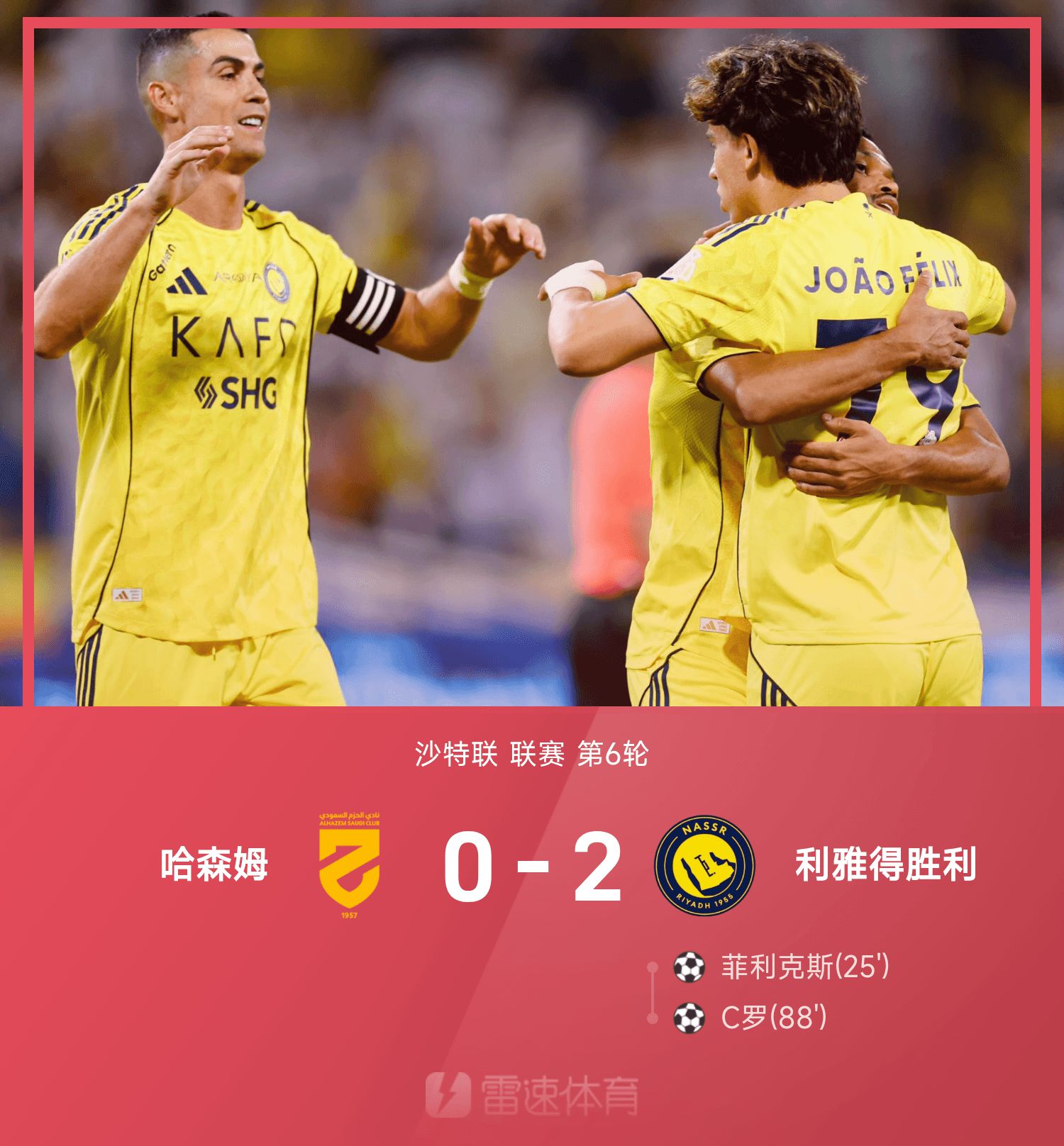 6686 Sports, 26 октября, В шестом туре саудовской лиги 25/26 Эр-Рияд победил Хашема со счетом 2:0. В первом тайме Феликс головой вывел мяч из тупика. Еще до конца второго тайма удар Роналду закрепил победу. В итоге Эр-Рияд разгромил команду гостей со счетом 2:0 против Хашема и выиграл 6 матчей подряд в чемпионате.