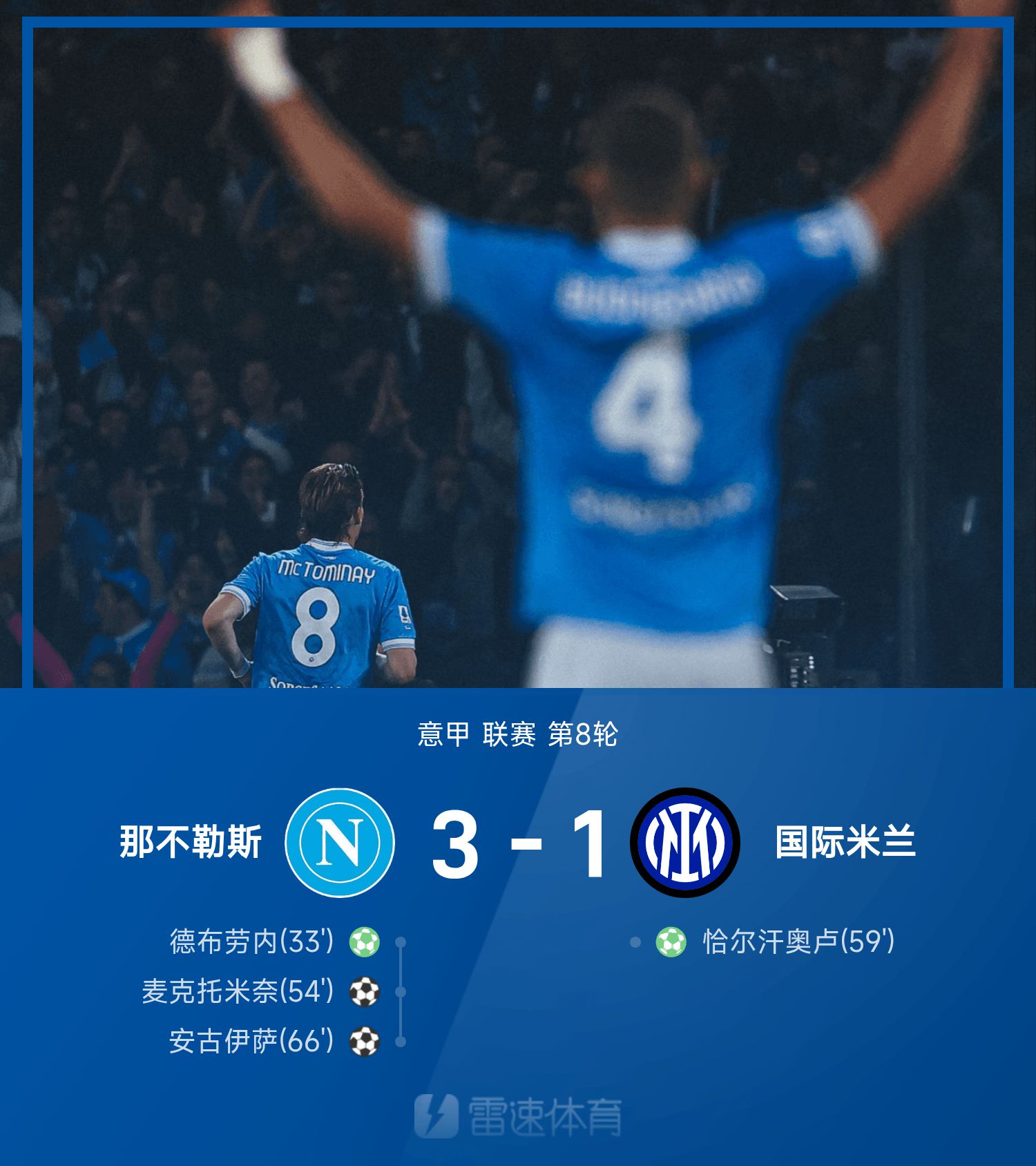 6686 Sports 26 октября В 8-м туре сезона 25/26 Серии А Неаполь победил миланский "Интер" со счетом 3:1. В первой половине игры Де Брюйне удалился из-за травмы после пенальти с 12 ярдов. Во второй половине игры Мактоминей и Ангиса забили по очереди, а Чалханоглу забил гол с 12 ярдов за миланский «Интер».