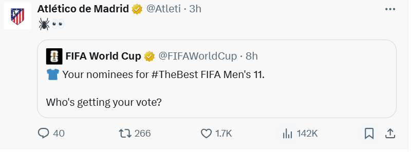 Клуб разместил список, объявленный ФИФА, в своих официальных социальных сетях и добавил два смайлика - паука (прозвище Альвареса - Маленький Паук) и пару широко раскрытых глаз, неявно, но мощно выражая их сомнения.