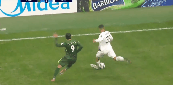 42’ Чжан Юнин был унижен тем, что его противник вел мяч под его промежностью, Фабио толкнул противника товарищи по команде