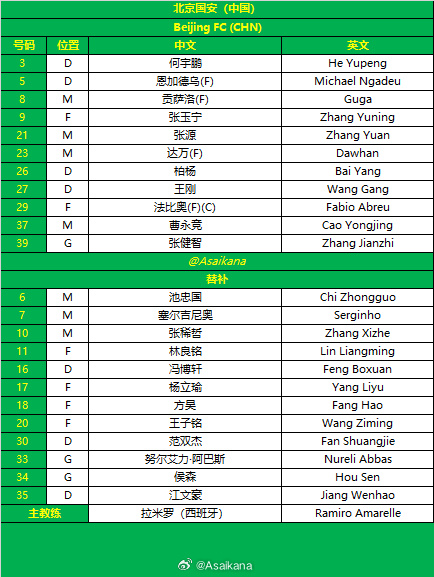 Стартовый состав «Пекин Гоань»:39 – Чжан Цзяньчжи, 3 – Хэ Юпэн, 5 – Нгадеву, 26 – Бо Ян, 27 – Ван Ган, 8 – Гуцзя, 21-Чжан Юань, 23-Давань, 37-Цао Юнцзин, 9-Чжан Юнин, 29-Фабио