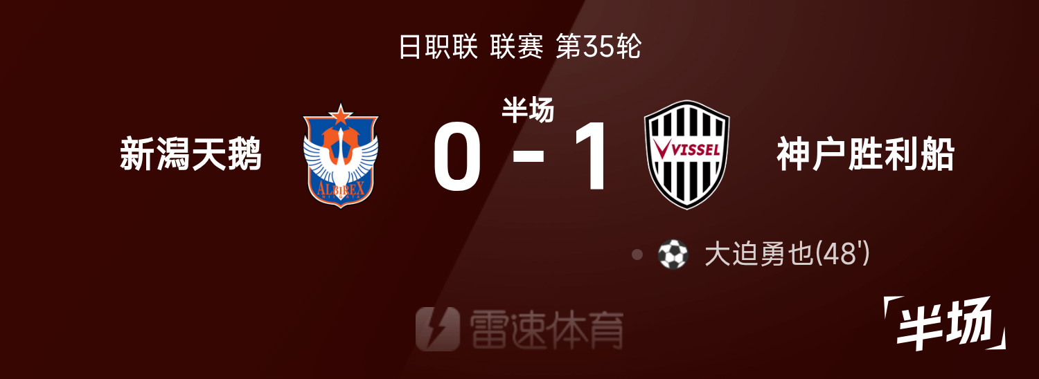 Перерыв в перерыве японской профессиональной лиги: Исаму Осако забил гол в добавленное время, Ниигата Сванс временно выиграла игру со счетом 0:1 Кобе