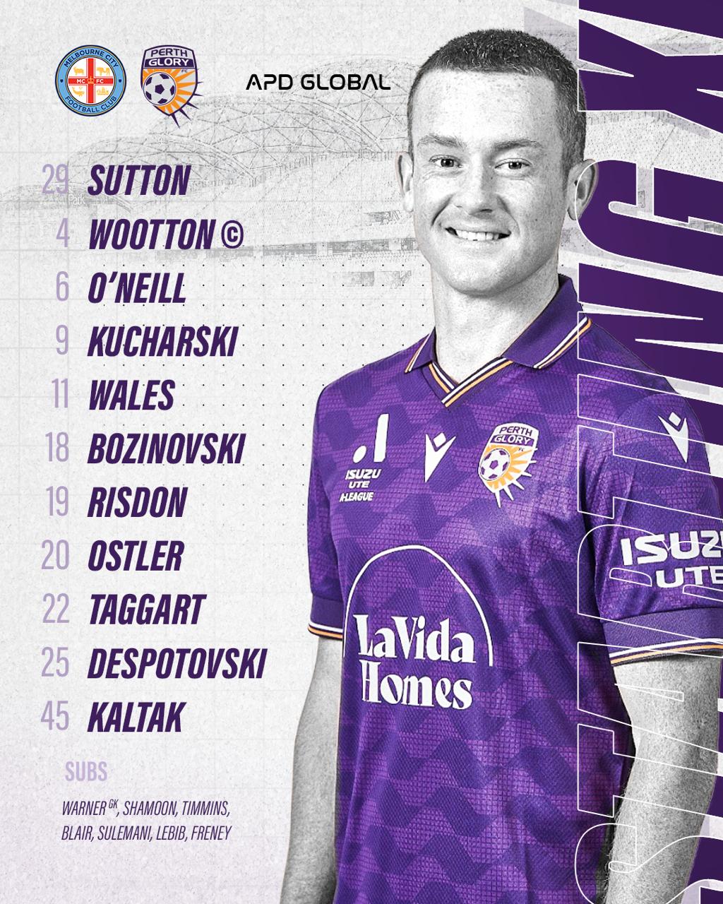 Стартовый состав «Перт Глори»: 29 — Саттон, 19 — Рисден, 4 — Вутон, 11 — Уэллс, 45 — Карл Такер, 20 — Остерлер, 6 — О’Нил, 9 — Кучальски, 18-Бозновский, 2 5-Деспотовский, 22-Таггарт