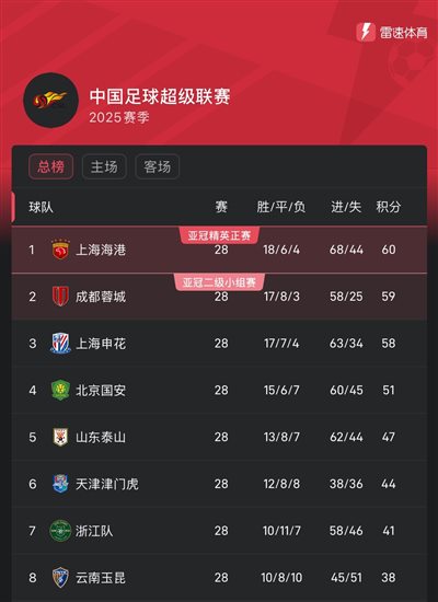 Ситуация в чемпионате китайской Суперлиги: В морском порту Чэнхуа Шэньхуа осталось всего 2 очка, Гоань полностью отстает