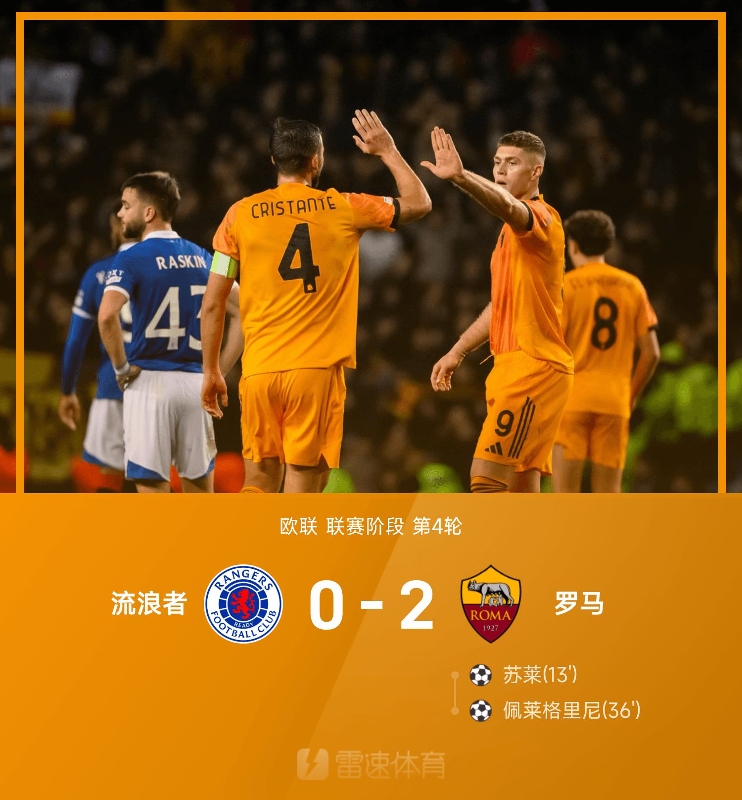 6686 Sports News от 7 ноября В четвертом туре Лиги Европы 25/26 «Рома» обыграла «Рейнджерс» со счетом 2:0. В первой половине игры Суле и Пеллегрини забили по очереди и помогли «Роме» одержать победу. Во второй половине игры Челик упустил возможность забить гол, и обеим командам не удалось изменить счет. В итоге гости «Ромы» разгромили «Рейнджерс» со счетом 2:0.