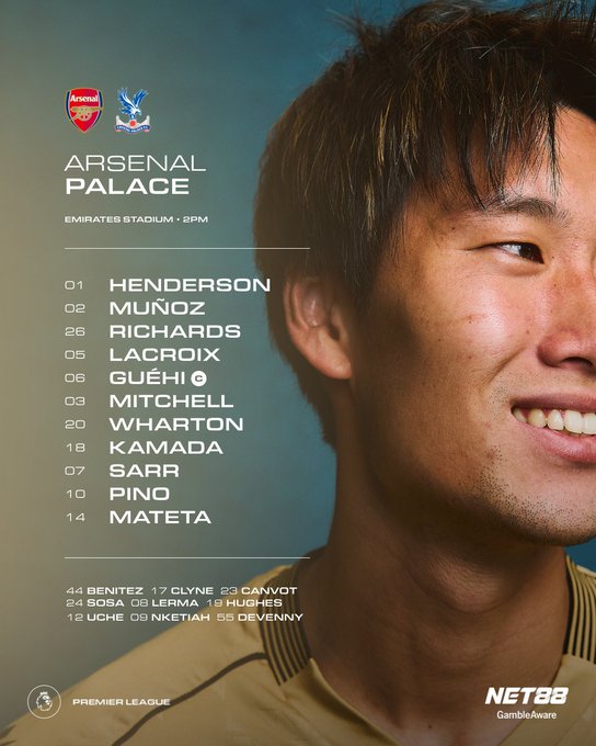 Стартовый состав «Кристал Пэлас»: 1-Дин Хендерсон, 2-Муньос, 3-Митчелл, 6-Ги, 5-Лакруа, 26-Ричардс, 18-Камада Даичи, 20-Уортон, 7-Сар, 10-Пино, 14-Маттета