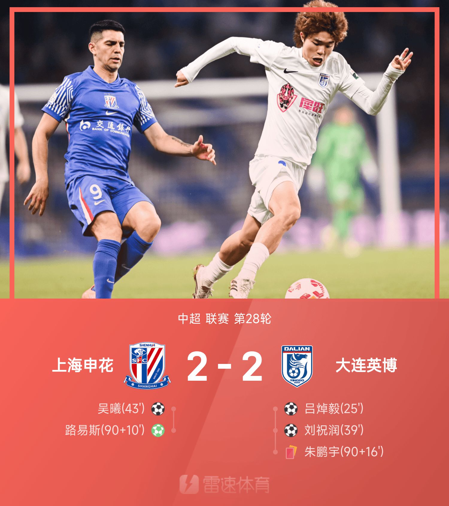 Отчет о матче китайской Суперлиги: У Си сделал вклад + очки, Луис забил ничью в добавленное время, Шэньхуа - Инбо 2-2