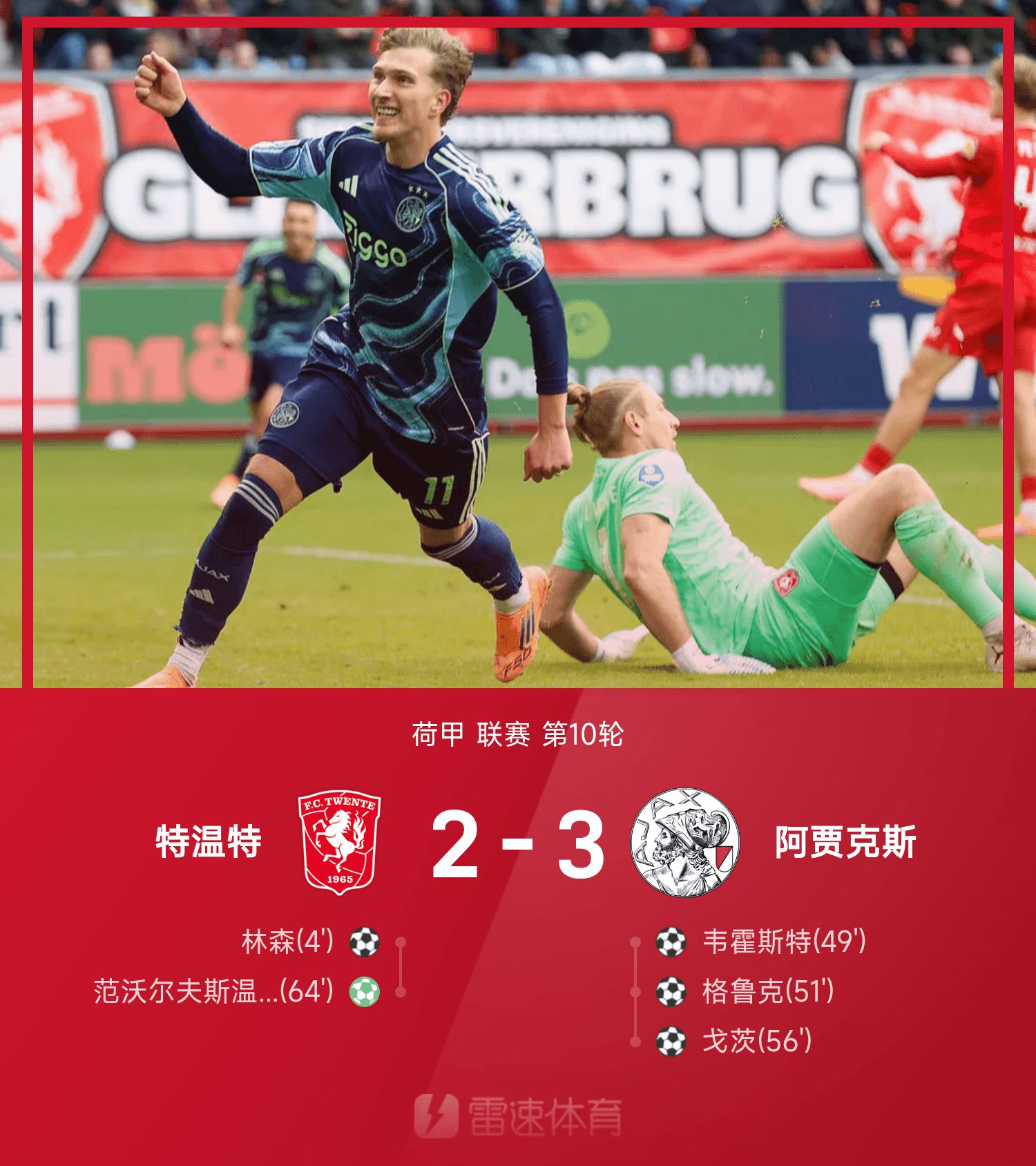 6686 Sports 26 октября В 10-м туре сезона 25/26 «Аякс» победил «Твенте» со счетом 3–2. На протяжении всей игры Линц начал игру с блица. Во втором тайме Вехорст, Глюк и Гетц забили 3 гола за 7 минут, завершив разворот. Ван Вольфсвинкель забил с 12 ярдов и спас игру.